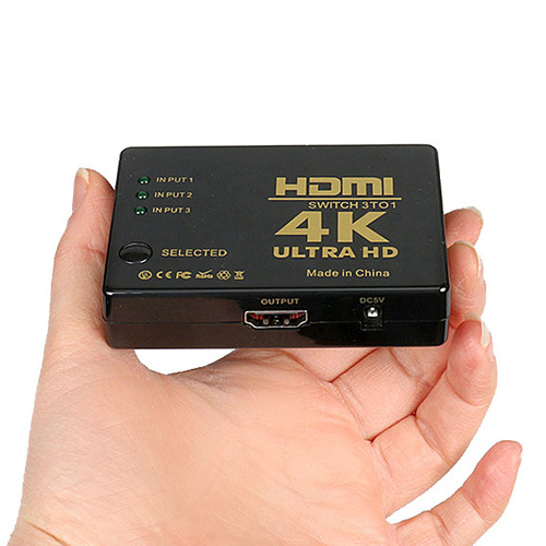سوییچ 3 پورت 4k UltraHD HDMI برای اشتراک گذاری چند سیستم پخش کننده ی تصویر به یک نمایشگر استفاده میشود. این محصول یکی از کاربردیترین اقلامی است که امروزه با پیشرفت تکنولوژی استفاده از آن نیز به نوعی الزام تبدیل گشته است. سوئیچ اچ دی ام آی 3 پورت زمانی مورد استفاده قرار میگیرد که بخواهید از چند دستگاه شبیه هم در موقع لزوم استفاده کنید، درواقع ما قصد داریم یکی از محصولات کاربردی و مورد استفاده در اکثر سازمانها و حتی شبکههای کوچک و یا حتی خانگی را به شما معرفی کنیم.این وسیله اتصال کننده دستگاهای پخش کننده به نمایشگر بصورت جداگانه است. بوسیله دکمه ی تعبیه شده روی دستگاه میتوان به صورت جداگانه پورت دستگاه را سوئیچ کرد. با پشتیبانی از بالاترین و بهترین کیفیت تصویری 4K Ulrta HD توانایی اتصال سه دستگاه گوناگون مانند پلی استیشن، رسیور، سینمای خانگی، گیرنده دیجیتال، دوربین، ایکس باکس ( باخروجی HDMI ) را به صورت همزمان به یک تلویزیون LCD یا LED دارای ورودی HDMI را دارد.
